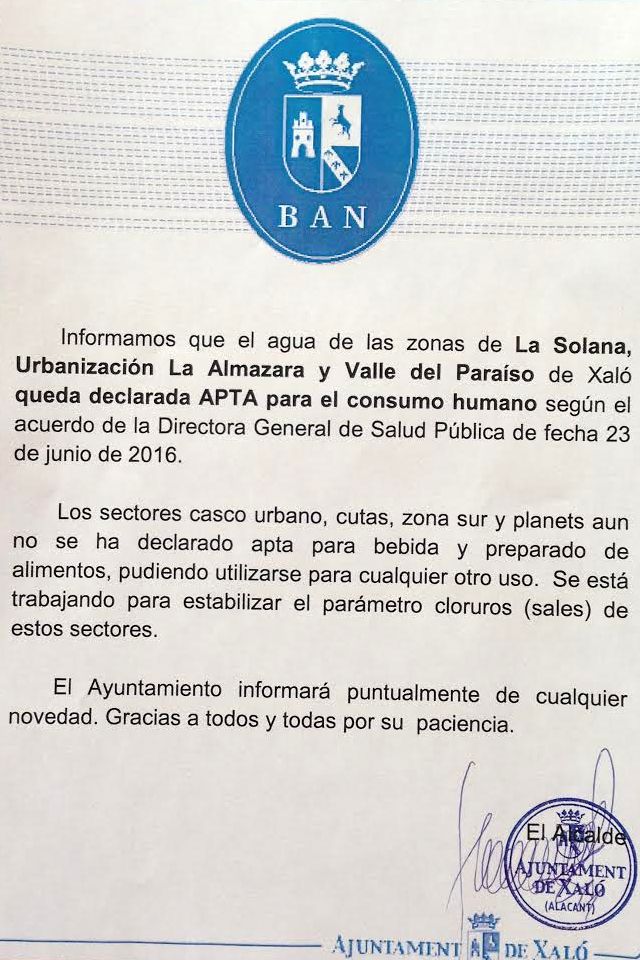 In La Solana, La Almazara and Valle del Paraiso tap water is declared potable by Public Health of the 23th of june 2016. In the rest of Xaló the levels of salt are too high, so the water is not potable. It can be used for other purposes, but not for cooking or drinking. We keep working on the solution and keep you informed on facebook: Xalo Townhall