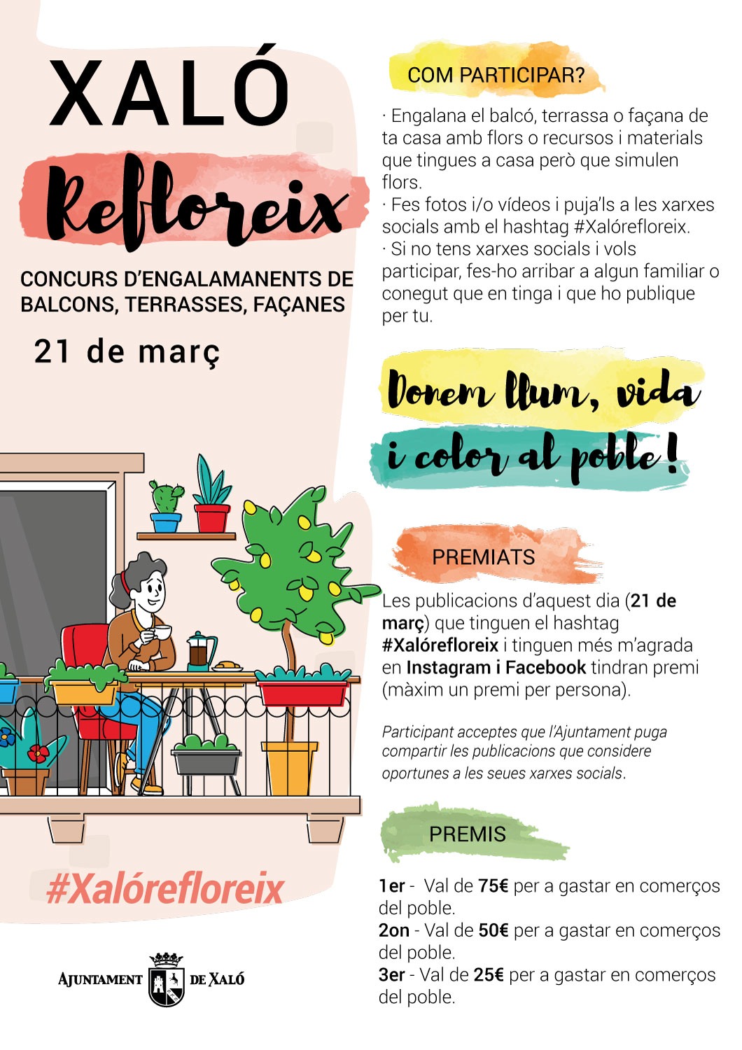 Todos los xaloners y xaloneras pueden participar en el concurso que ha lanzado el ayuntamiento bajo el nombre de «Refloreix» y con el que se quiere llenar de flores las calles del pueblo. Habrá premios para los engalanamientos más bonitos en forma de dinero para gastar en los comercios de Xaló.